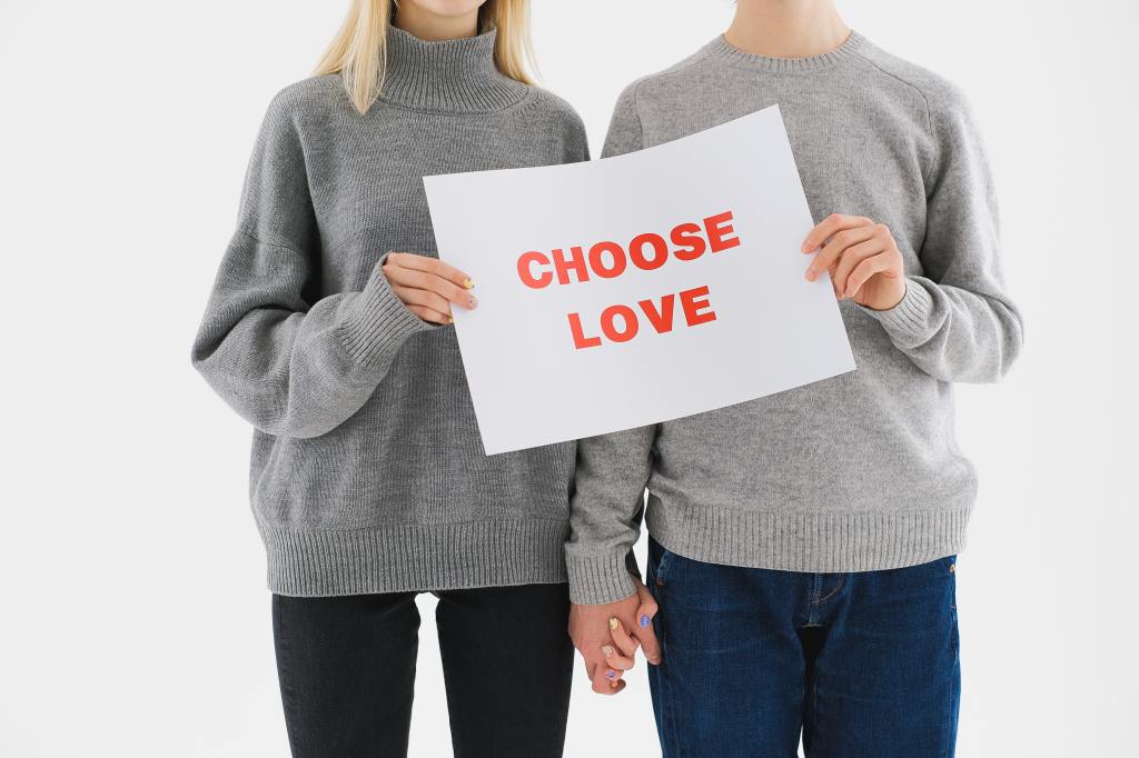 Photo by Anna Shvets: https://www.pexels.com/photo/a-couple-in-gray-sweater-holding-white-paper-with-choose-love-print-6899149/